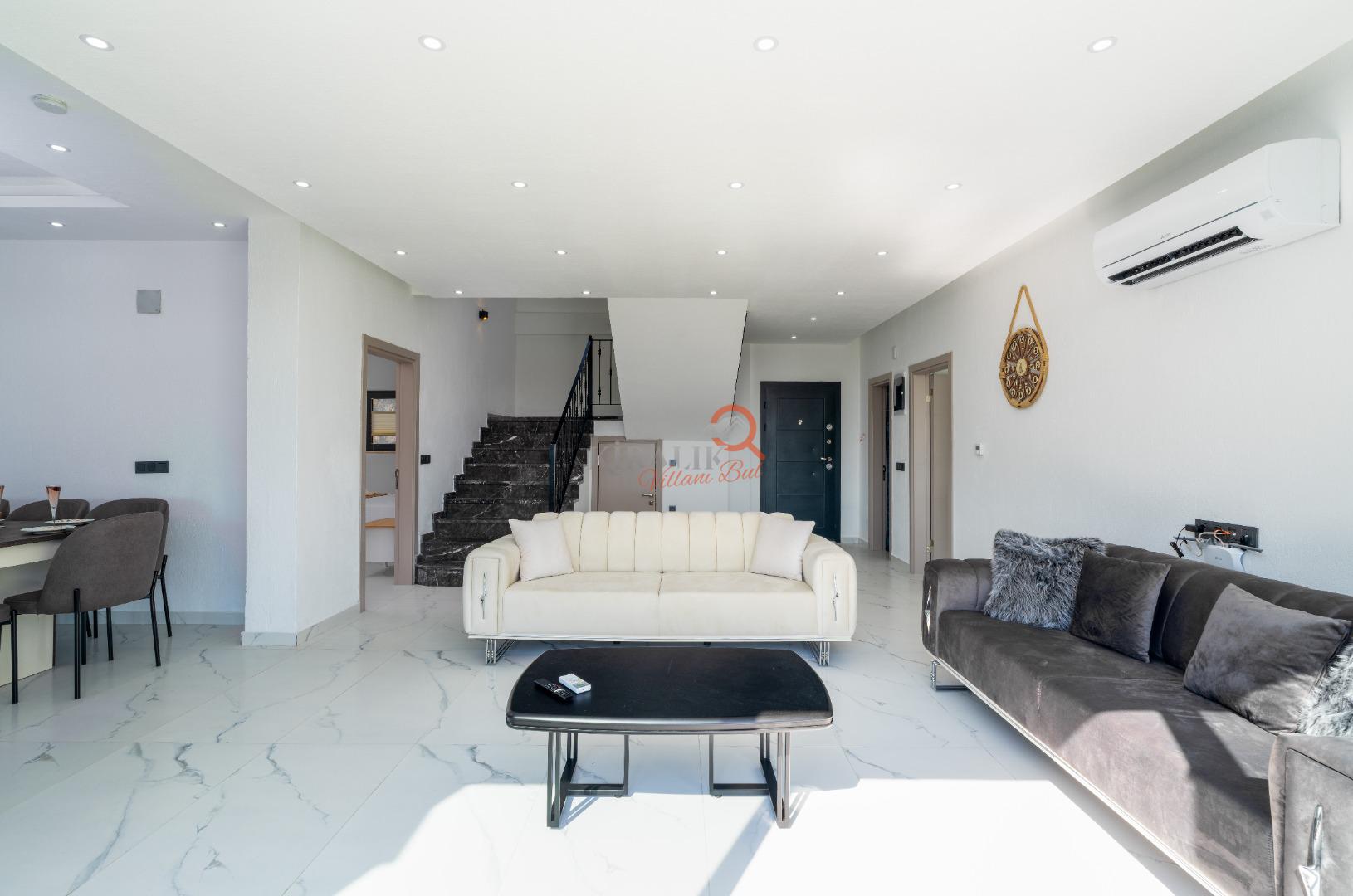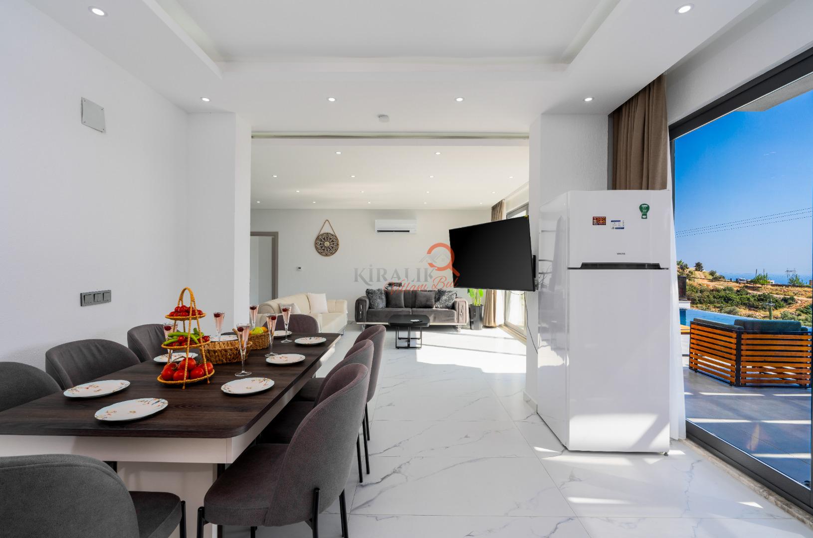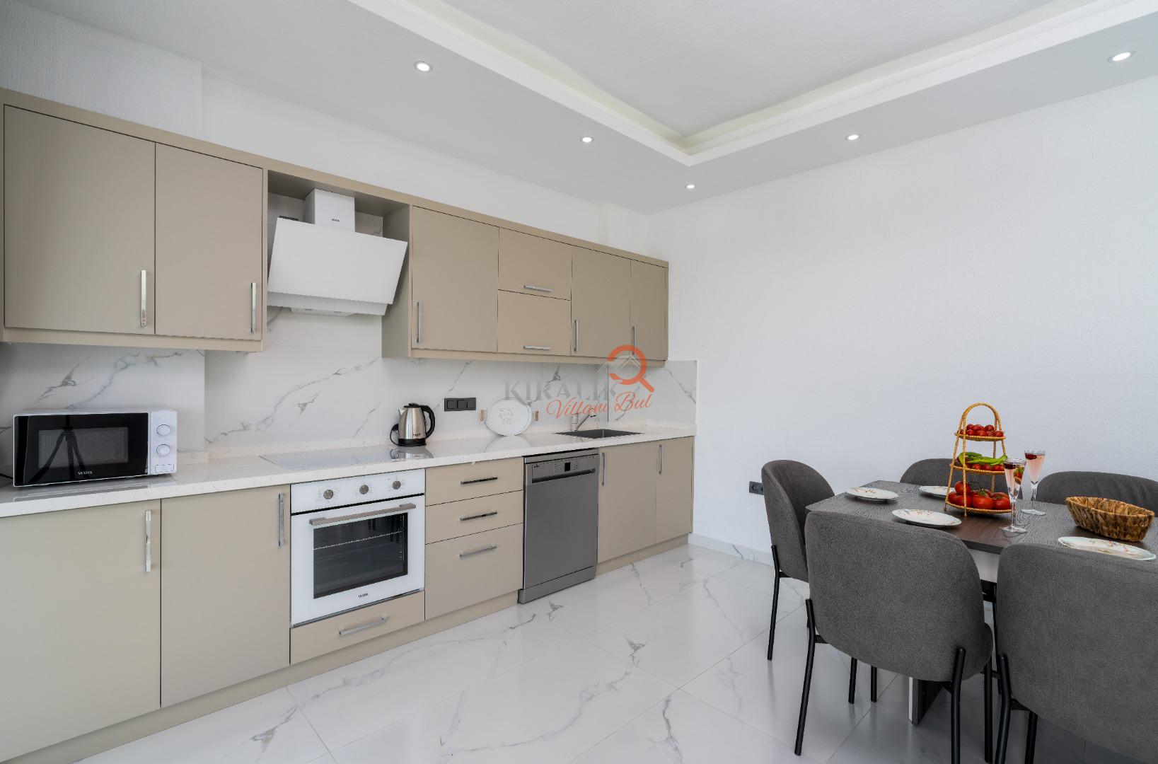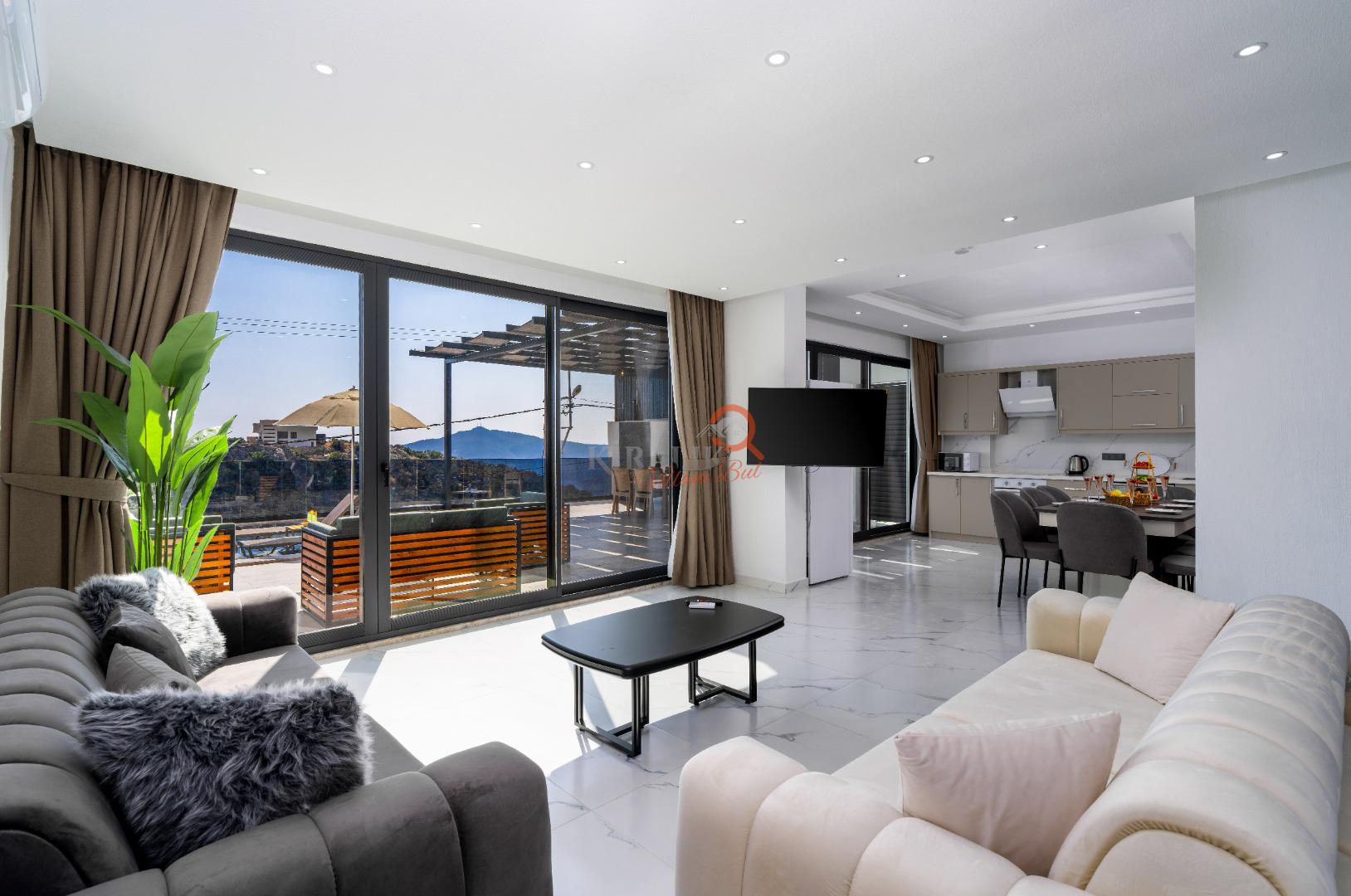 Geniş salon alanı, tam donanımlı mutfak ve konforlu oturma grupları ile hem dinlenebileceğiniz hem de keyifli vakit geçirebileceğiniz bir ortam sunar.