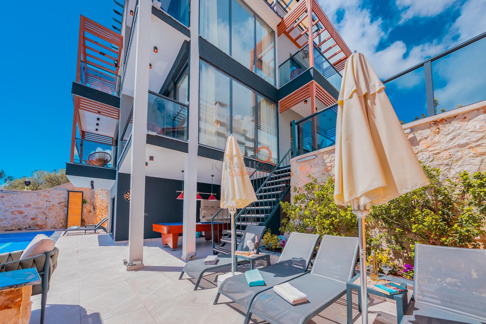 Villa Tekin Kalkan, lüks, konfor ve eğlenceyi bir arada sunan eşsiz bir tatil deneyimi vaat ediyor. Deniz manzaralı jakuzide rahatlayın, özel havuzunuzda serinleyin, arkadaşlarınızla bilardo oynayın ve Kalkan'ın büyüleyici atmosferinin tadını çıkarın.