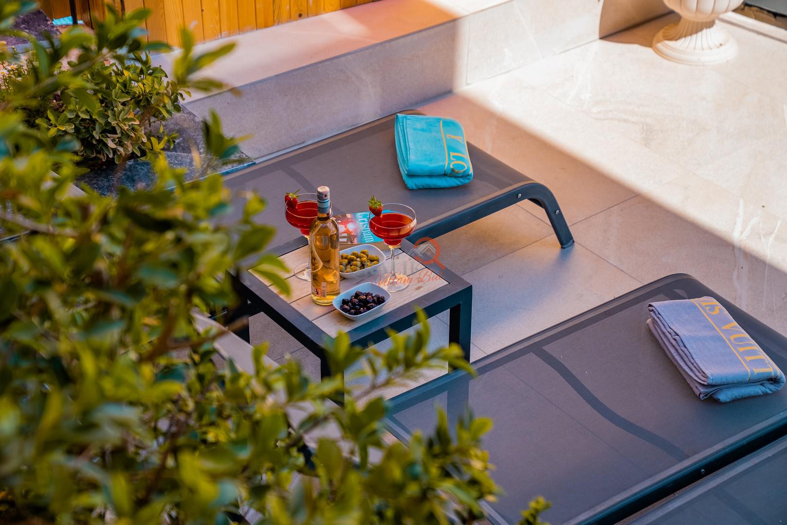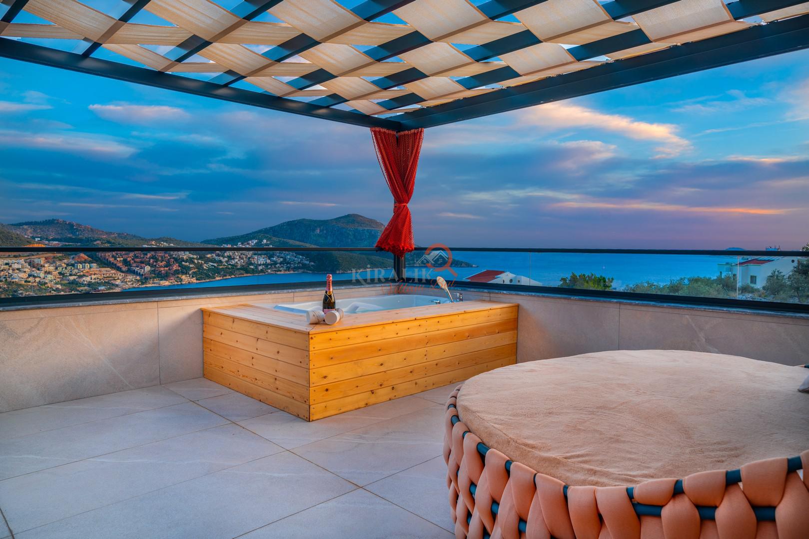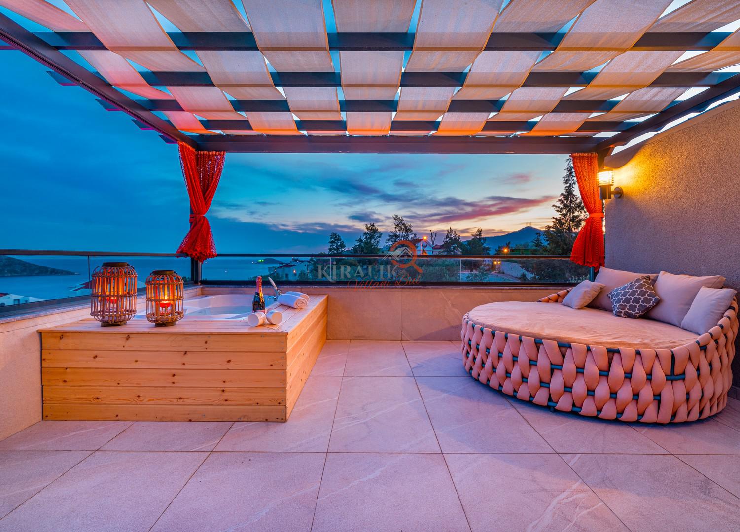 Üst teras katında yer alan jakuzi, yorgunluğunuzu atarken Akdeniz'in büyüleyici manzarasının tadını çıkarmanızı sağlıyor. Güneşin denizde batışını izlerken, sıcak suyun rahatlatıcı etkisiyle günün stresini üzerinizden atın.